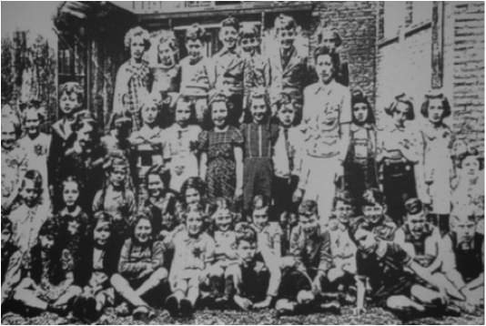 Esther staat rechts van de lerares in de Joodse klasje in Amsterdam. Slechts enkele kinderen overleefden de oorlog